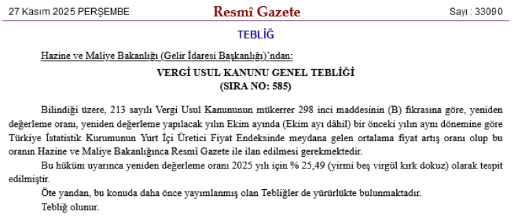 Tebliğde, Vergi Usul Kanunu’nun mükerrer 298’inci maddesi uyarınca belirlenen 2025 yılı yeniden değerleme oranının yüzde 25,49 olduğu açıklandı.