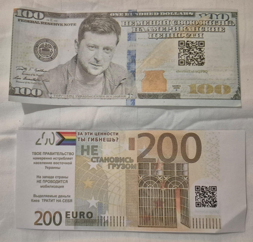 Koyu yeşil Amerikan dolarının üzerine basılan Zelenski’nin yanına ‘Ukraynalıların Hayatlarının Ticaretini Yapan’ ibaresi yerleştirilirken; “Amerikan doları için hayatını değişme? Batı, senin ülkeni poligon olarak kullanıyor. Hayatını pazarlama. Teslim ol” ifadeleri yer alıyor.