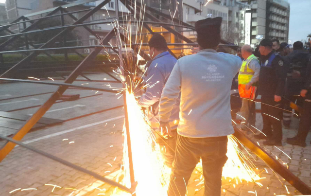 Demirlerin kesildiği sırada Kuşadası Belediyesi ekipleri de alana geldi. Tarafların akşam saatlerinde karşı karşıya gelmesiyle gerginlik yükseldi. Sözlü tartışmaların kavgaya dönüşmesi üzerine bölgeye polis ekipleri sevk edildi. Polis, taraflar arasında barikat kurarak müdahalede bulundu.