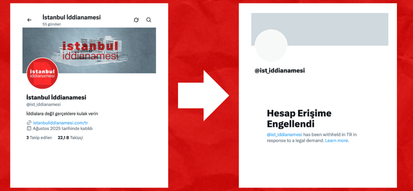 İfade Özgürlüğü Derneği kararı, “İstanbul Büyükşehir Belediyesi’ndeki (İBB) “yolsuzluk” iddialarıyla ilgili yürütülen soruşturma kapsamında İstanbul Cumhuriyet Başsavcılığı’nın hazırladığı iddianamenin ardından “İstanbul İddianamesi” adıyla açılan ve dosyada yer alan iddiaları ele alan (istanbuliddianamesi.com/tr) internet sitesi ve X hesabı (ist_iddianamesi), 5651 sayılı Kanunun 8/A maddesi uyarınca, millî güvenlik ve kamu düzeninin korunması gerekçesiyle erişime engellendi. Hesap, X tarafından Türkiye’den görünmez kılındı.” diye duyurdu.