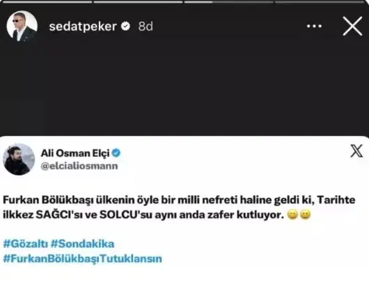 Furkan Bölükbaşı için “Öyle bir milli nefreti haline geldi ki, tarihte ilk kez sağcısı ve solcusu aynı anda zafer kutluyor” ifadelerini kullanan sosyal medya kullanıcısının paylaşımını Sedat Peker de kendi hikayesinde paylaştı.