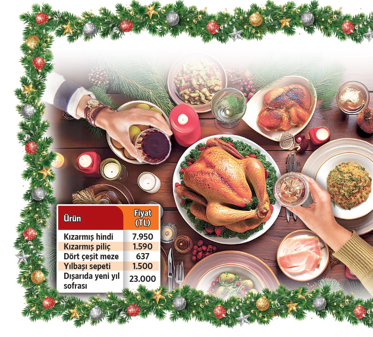 Geçen yıl 8.619 TL’ye kurulan yeni yıl sofrasının maliyeti, bu yıl içki seçeneği de eklenince 12.000 TL’ye yükseldi. Ortalama 4-6 kişilik bir sofrada hindi, meze, alkollü içecekler ve kuruyemiş gibi ürünlerin bulunması durumunda, ortalamada 12.000 TL’lik bir fatura ortaya çıkıyor.